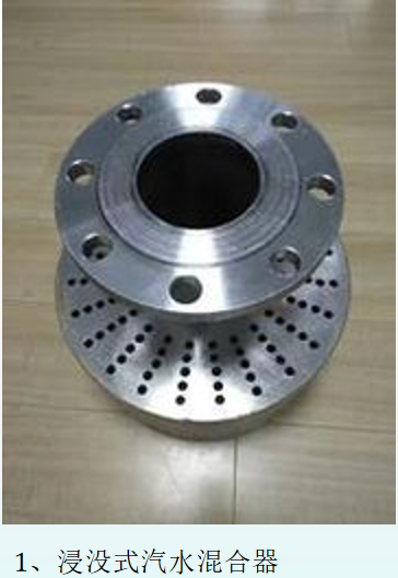 管道式汽水混合器主要由噴管、殼體、網(wǎng)板等部分組成。被加熱水通過呈拉法爾管狀的噴管時,蒸汽從噴管外側(cè)通過管壁上許多斜向小孔噴入水中,二者在高速流動中瞬時良好混合,以達到加熱水的目的。