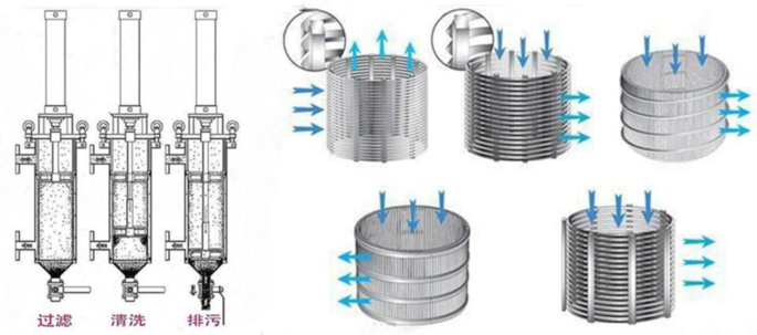 1、過濾:待過濾液體通過進(jìn)液口進(jìn)入過濾器,在過濾過程中,水中的雜質(zhì)堆積在不銹鋼濾網(wǎng)上,內(nèi)層雜質(zhì)逐漸堆積,內(nèi)外兩側(cè)由此產(chǎn)生壓差,通過壓差開關(guān)監(jiān)測進(jìn)出水口的壓差變化;