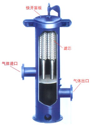干氣過濾器是一種濾芯式過濾器,里面由多支濾芯組成,過濾的原氣由進(jìn)氣口通過導(dǎo)流管或者旋風(fēng)管,將氣體中含有的固體顆粒及油霧碰撞落入容器底部,通過導(dǎo)管進(jìn)入分離器底部積液包,可通過觀察視鏡窗口外排。然后從濾芯外表面進(jìn)入濾芯里面進(jìn)行精度分離,潔凈后的氣體導(dǎo)入絲網(wǎng)除沫器,經(jīng)過第三部過濾導(dǎo)出。